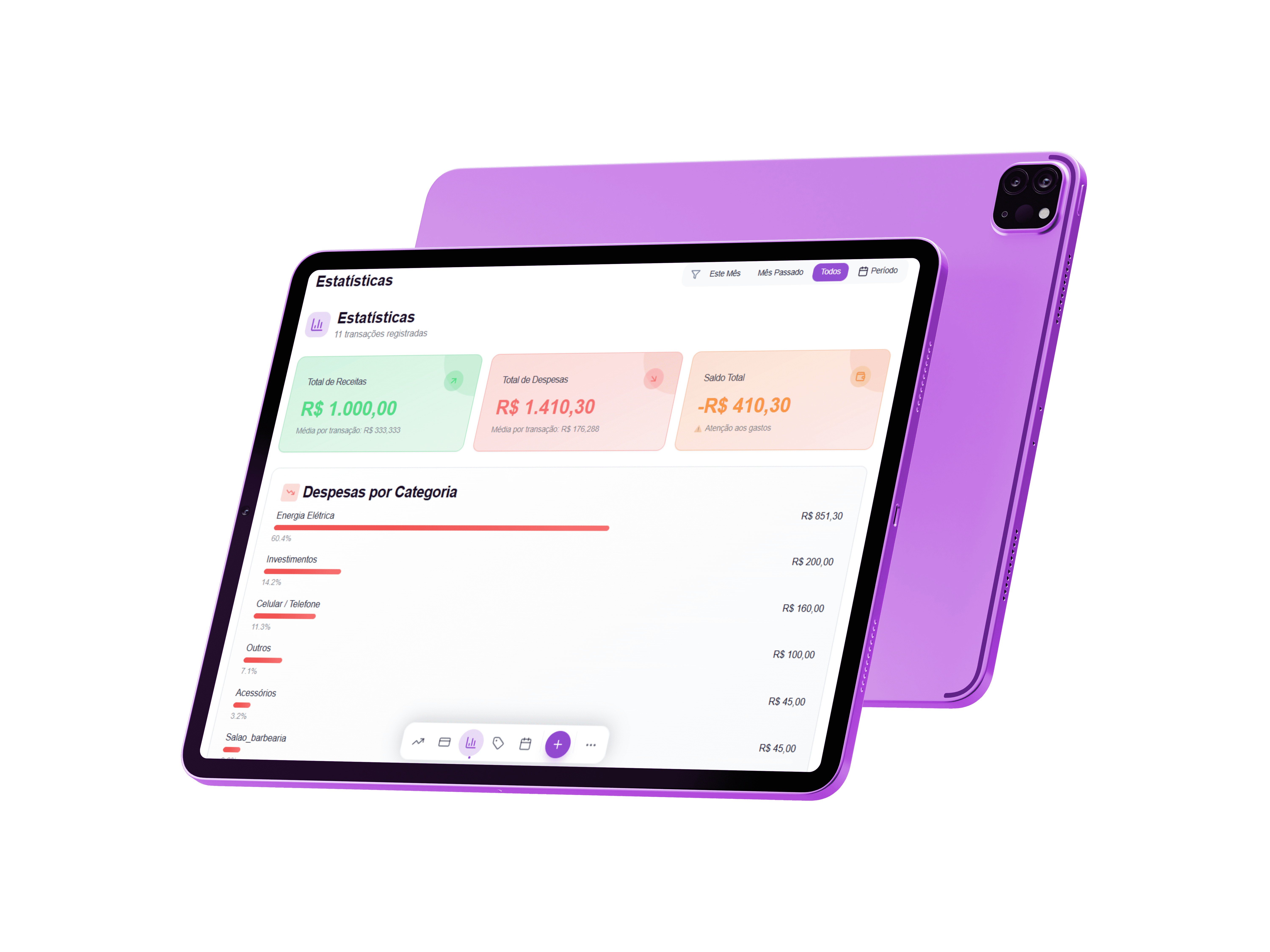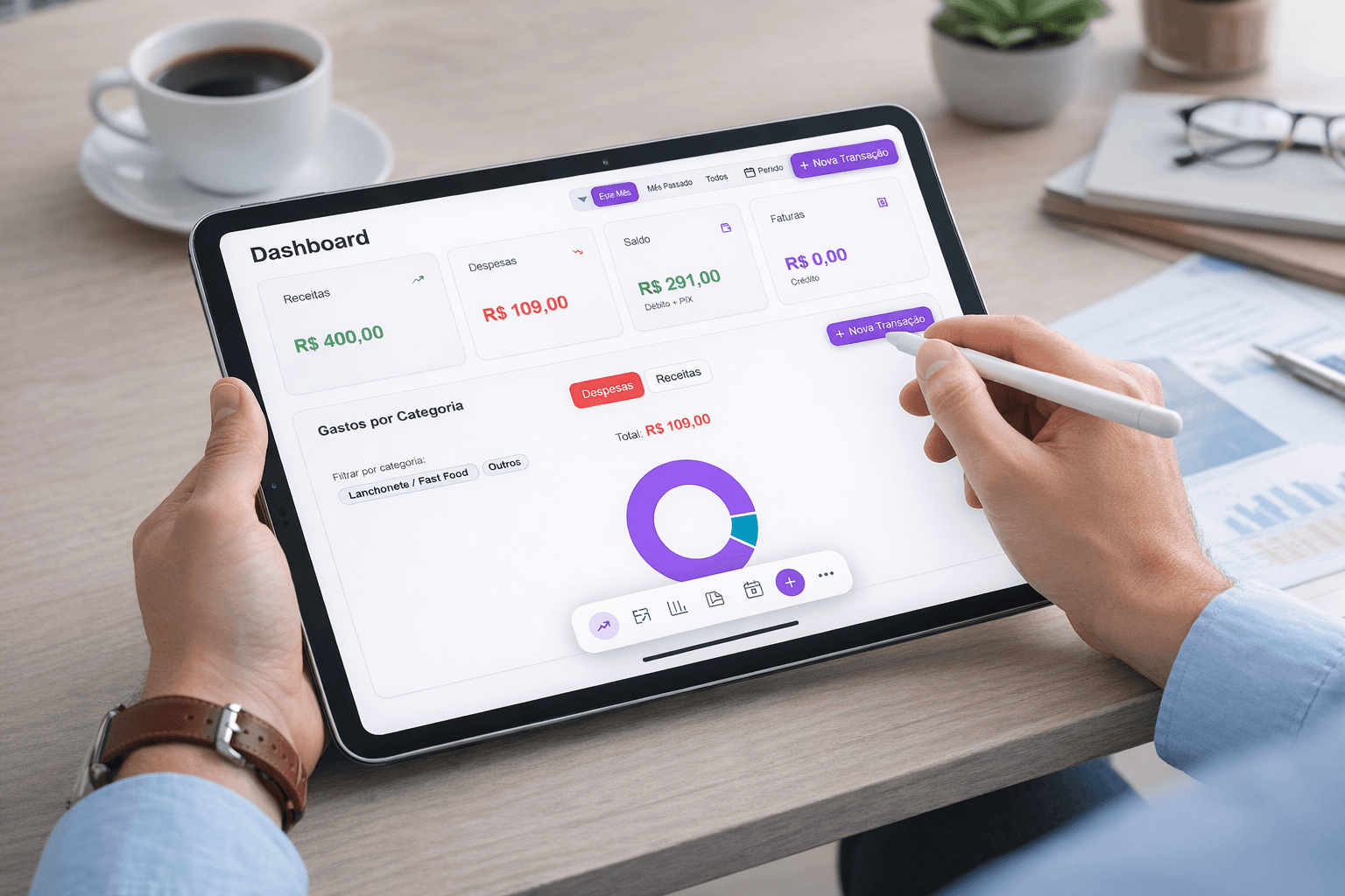 Com ela, você registra entradas e despesas rapidamente e acompanha tudo em um painel financeiro claro e organizado.